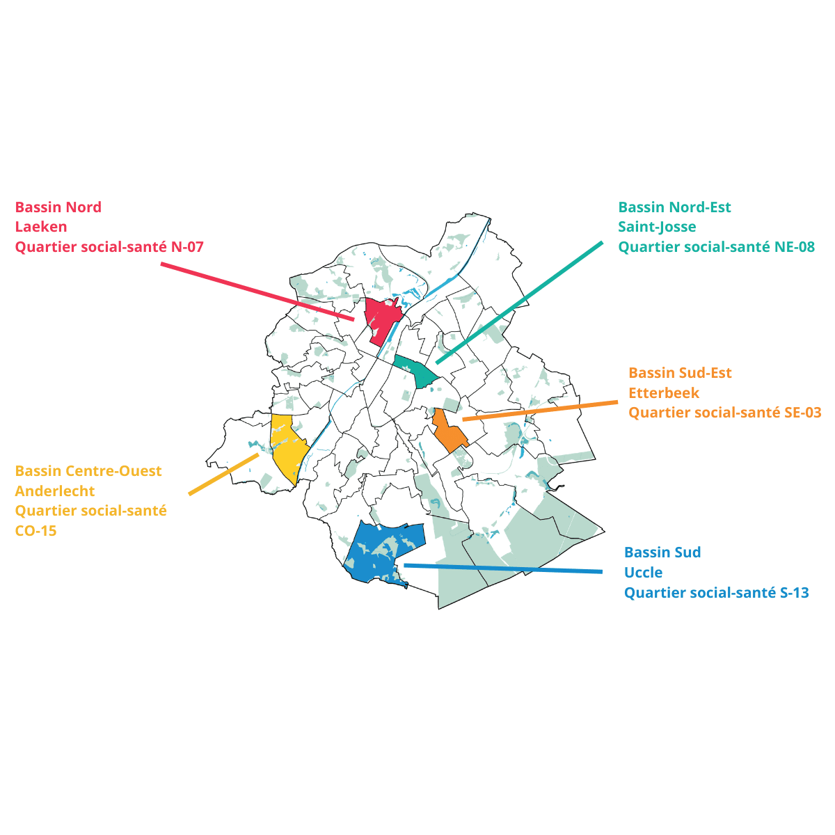 Dans le Bassin Sud-Est, le quartier social-santé ciblé est le suivant : Quartier social-santé SE-03, correspondant aux quartiers « La Chasse » et « Jourdan » dans la commune d’Etterbeek. Ce quartier a été choisi car les données chiffrées y indiquent un moindre accès au dépistage, alors que le secteur abrite une population dense et un taux de précarité relativement élevé par rapport au reste du Bassin Sud-Est.